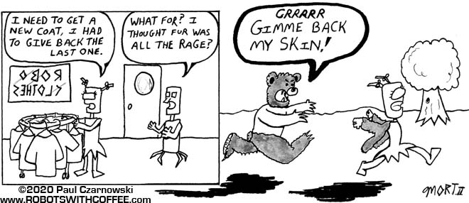 Another groaner. I could have set it up differently, flipping the first panel around. “Why’d you get rid of the fur coat? I thought it was all the rage.” “Yeah, that’s the problem!” And then the next panel.
